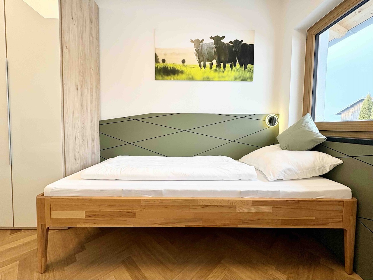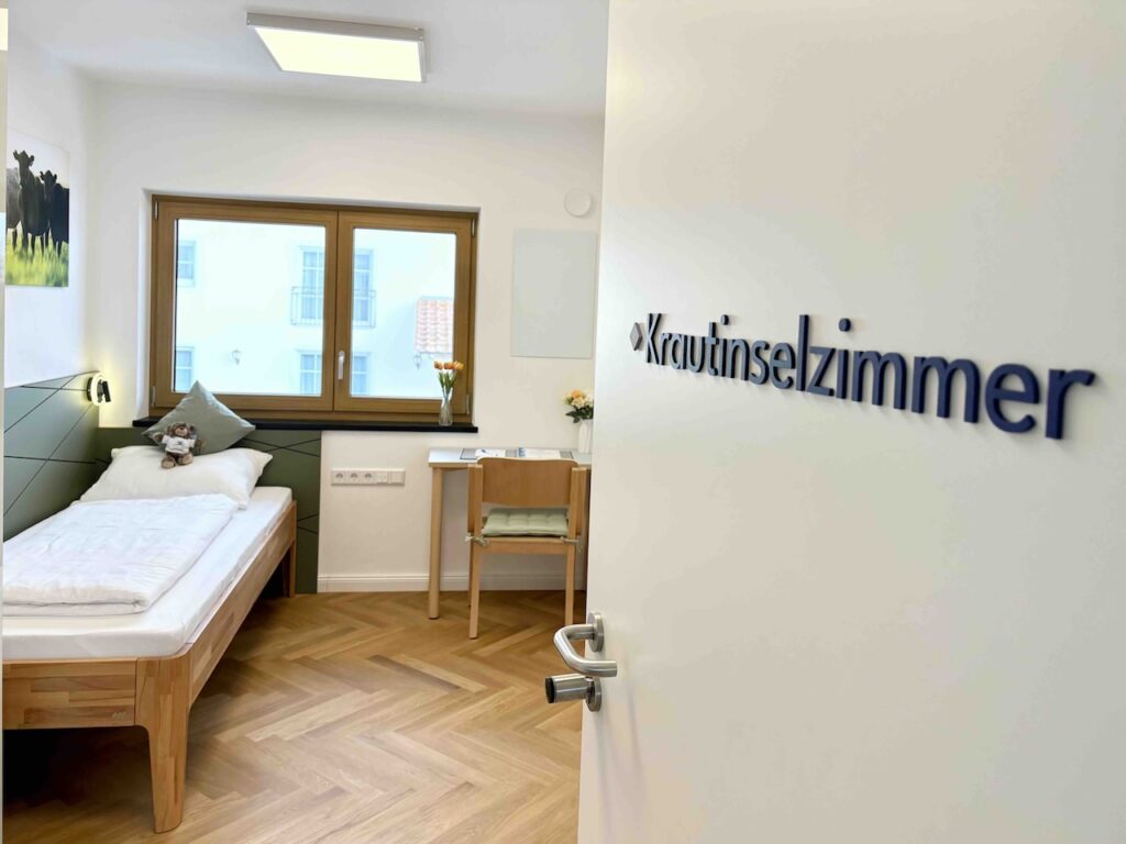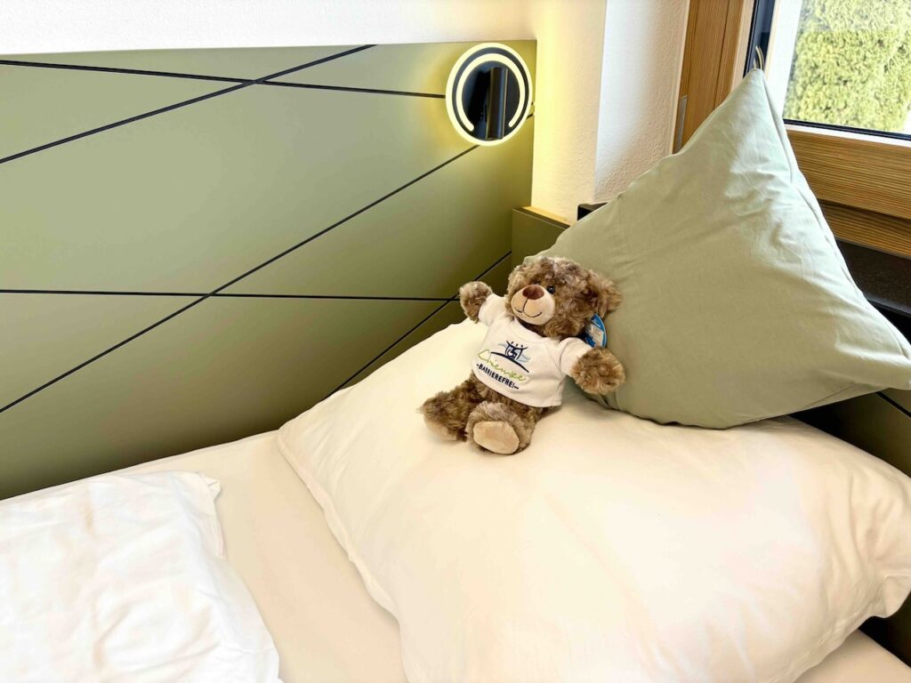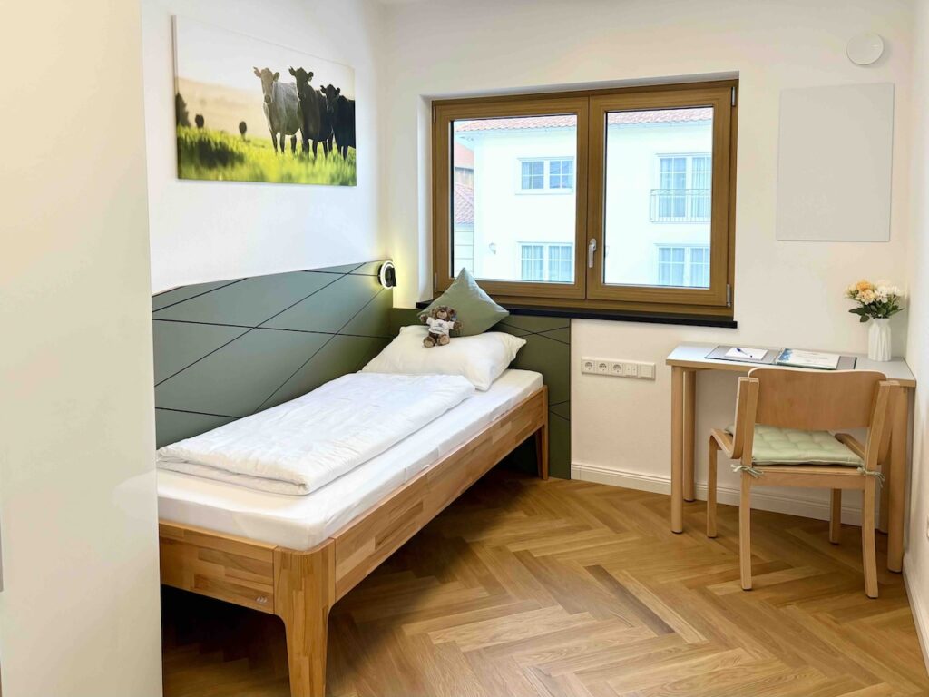 Dieses Dreibettzimmer ist nach Norden ausgerichtet und bietet euch dank des großen Fensters genügend Tageslicht. Das eingebaute Doppelbett (160 cm) ist harmonisch in eine Wandnische eingelassen und schafft so eine ganz besondere Schlafatmosphäre mit viel Gemütlichkeit und Rückzugscharakter. Das Einzelbett ist von einer Bettseite aus mit dem Rollstuhl nutzbar (120 cm Wendekreis). Das eigene Badezimmer ist modern gefliest und verfügt über eine schwellenfreie Dusche, unterfahrbares Waschbecken, WC mit Haltegriffen, Fußbodenheizung und großzügigen Spiegel.